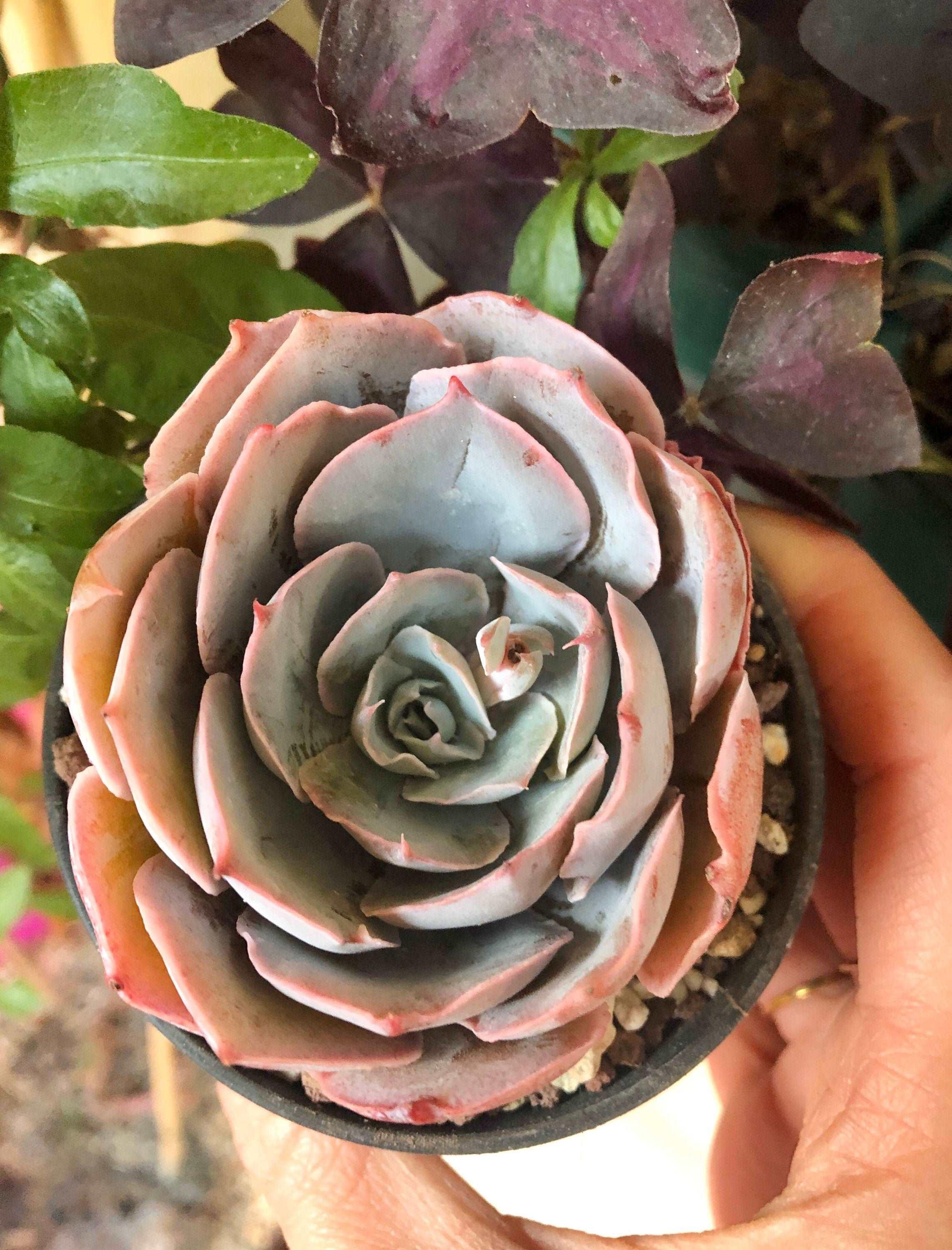 Echeveria 'Pinky' which is a hybrid of Echeveria shaviana x Echeveria cante. āPinkyā forms a rosette about 9ā (23 cm) across with slightly crinkled leaves of a rosy bluish grey. Because the leaves are coated with farine, this delicate beauty is happiest when grown in a greenhouse or under glass: avoid wetting the leaves!
