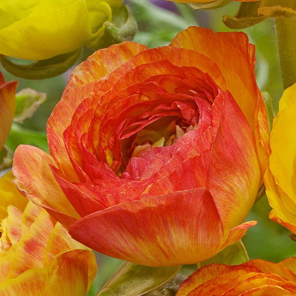 Ranunculus, especially known as a long-life cut flower. Mixture of orange, red and pink tones and beautiful intermediate colors. First soak before planting. Summer flowering if planted in spring, flowering from the end of April if planted in autumn.