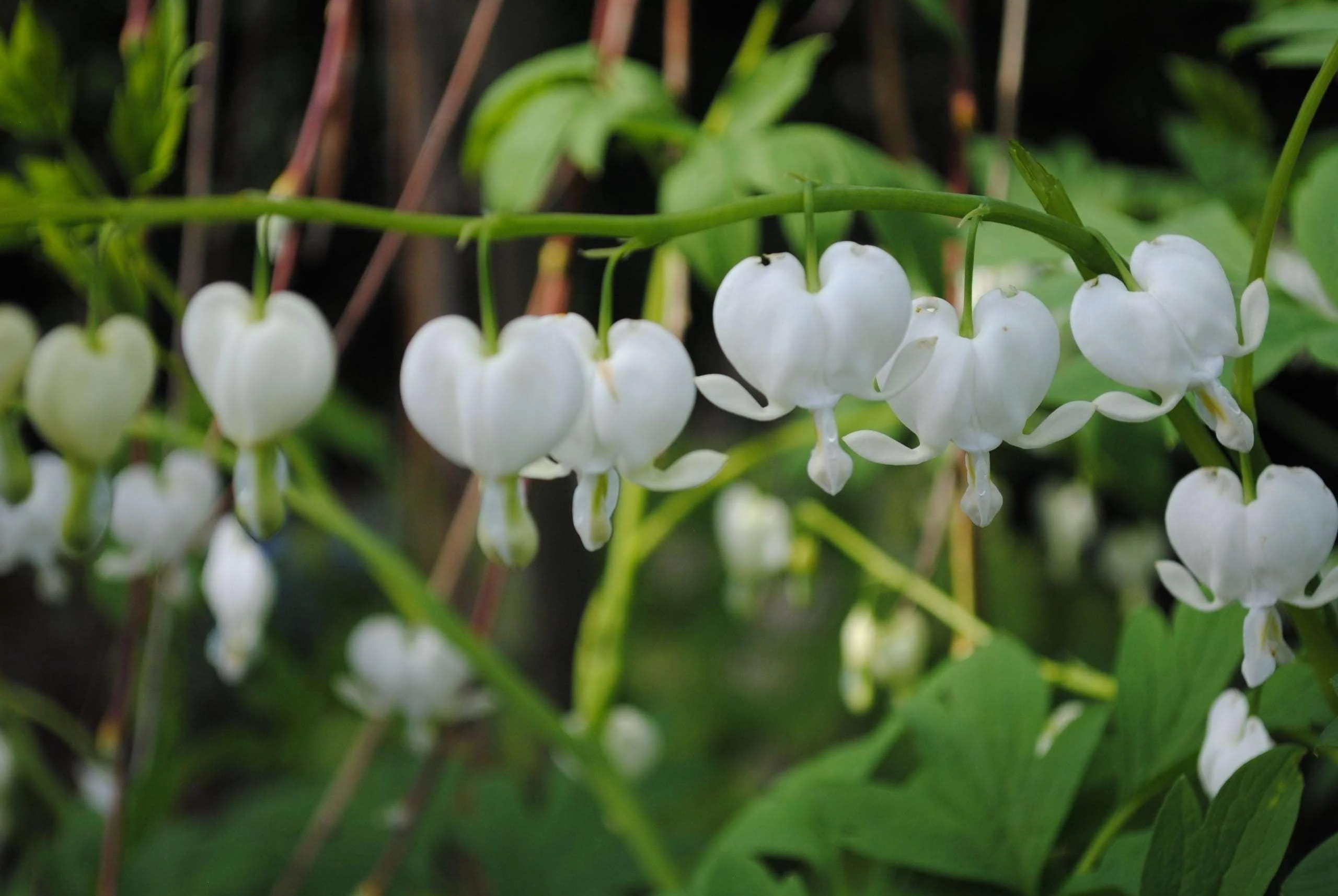 Dicentra spectabilis Alba, now called Lamprocapnos spectabilis, or more commonly referred to as either the bleeding heart plant or the "Lady in the Bath". It bears white, heart-shaped flowers with white tips, which hang from arching flower stems in late spring to early summer. Although it grows in light shade and looks good growing in clumps amongst shrubs, it often does even better in a sunny border, provided the soil stays sufficiently moist.